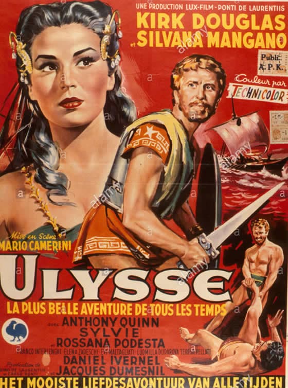 Aujourd’hui, le fait que Ulysse soit incarné par Kirk Douglas et que la réalisation soit due à Mario Camerini, excellent cinéaste italien dont j’aime beaucoup aussi « Kali Yug », sorte de séance de rattrapage du « Tigre du Bengale » de Fritz Lang, me font comprendre pourquoi j’ai aimé dès le début cette version filmée de « L’Odyssée ». Ulysse, c’était le gars pas compliqué, toujours prêt à rendre service aux copains, histoire de se foutre sur la gueule avec eux et de boire des coups. Là, en l’occurrence, son pote Ménélas apprend qu’il est cocu et il rameute toute une petite troupe pour aller contrer ceux qui s’opposent à lui. Cette sorte d’élection ne se fait pas en deux tours mais en 10 ans. Donc, ça fait 10 ans que l’Ulysse est loin de chez lui et de sa femme Pénélope quand il programme son retour. Vous me suivez. Parce qu’allez savoir ce qui se passe, les trajets directs n’existent plus, il opte genre pour un Ouigo maritime avec quantité d’escales, s’amuse pendant les unes, se paume un peu avec les autres, rencontre bien sûr quelques jolies nanas pour occuper son temps libre, se marave avec un cyclope, écoute le chant des sirènes en prenant bien soin de se faire attacher… Bref, un Club Méd qui dure lui aussi 10 ans, autant que la guerre de Troie.
